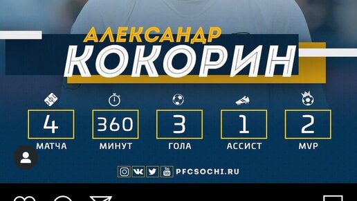 Добрый день друзья, сегодня мы поговорим о футболисте, который действительно умеет удивлять и речь пойдет о Александре Кокорин. Футбольный клуб с черноморского побережья "Сочи" сегодня выложил статистику Кокорина в свой инстаграм и Саша реально удивляет, но в этот раз приятно. В посте говорится о том, что за 4 игры за команду из города Сочи, Александр забил 3 гола и отдал голевую передачу, что является отличным результатом для футболиста, который вернулся после такого долгого перерыва... Напомню,...