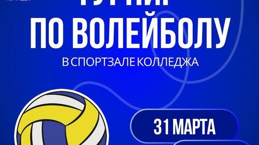 ! 31 марта в 17:10 в спортивном зале Колледжа РГСУ состоится волейбольный турнир. Приглашаем студентов и преподавателей принять участие и поддержать команды. 📍 Где: Колледж РГСУ, ул. Лосиноостровская, 40 к.2 (спортивный зал) 👥...