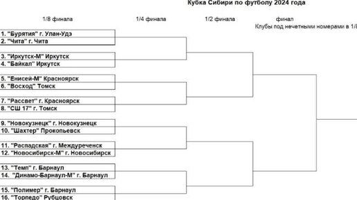 В нём примут участие 16 команд Определились участники розыгрыша Кубка Сибири 2024 года, а также появилась турнирная сетка. Об этом сообщает ФК «Бурятия». В кубке среди любительских команд союза федераций футбола «Сибирь» примут участие 16 команд со стадии 1/8 финала. В следующий раунд пройдёт команда, одержавшая победу по итогам двухматчевого противостояния. В 1/8 финала «Бурятия» проведёт две игры с футбольным клубом «Чита». Состав участников розыгрыша 2024 года: 1. «Байкал» г. Иркутск 2. «Бурятия» г...