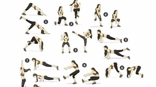 Комплекс упражнений для стройных ног, который вы можете выполнять у себя дома и для которого не потребуется никакого специального оборудования. Комплекс состоит из восьми упражнений: 1. Подъем ноги с подтягиванием колена к животу в позе "собаки" - 20 повторений (10 на каждую ногу) 2. Выпад с поднятием колена в прыжке - 30 повторений (15 на каждую ногу) 3. Приседания с ударом ноги - 30 повторений (15 на каждую ногу) 4. Приседания в стиле сумо с поднятием колена вверх - 30 повторений (15 на каждую ногу) 5...