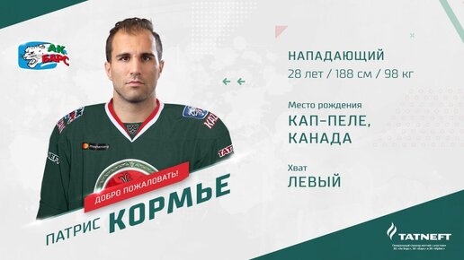 «Ак Барс» заключил контракт с нападающим Патрисом Кормье – соглашение рассчитано до конца сезона 2019/20. Патрис Кормье родился в Кап-Пеле (Канада) 14 июня 1990 года, воспитанник клуба «Кап-Пеле Старс». На профессиональном уровне выступал за команды «Чикаго Вулвз» (АХЛ), «Атланта Трешэрс», «Виннипег Джетс» (обе − НХЛ), «Сент-Джонс Айскэпс», «Манитоба Мус» (обе − АХЛ), «Барыс» (КХЛ). Победитель (2009) и серебряный призёр (2010) молодёжного чемпионата мира в составе сборной Канады. В сезоне 2018/19 КХЛ центрфорвард провёл 67 матчей, в которых набрал 44 (19+25) очка при показателе полезности +20...