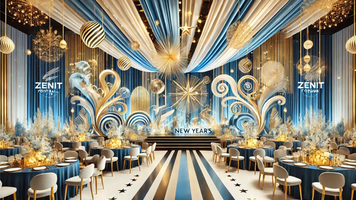 Пофантазировали, как может выглядеть новогодний корпоратив любимого питерского Футбольного Клуба Зенит. Для этого выбрали волшебную концепцию, ведь под Новый год всем хочется подвести итоги и погрузиться в сказочную атмосферу праздника. Использовали корпоративные цвета клуба - синий, белый, голубой. В качестве акцента добавили золото, символизирующее чемпионство и звездность команды. В оформлении зала вместе с новогодними украшениями используем абстрактные символы: плавные ленты, переплетенные круги и падающие звезды...