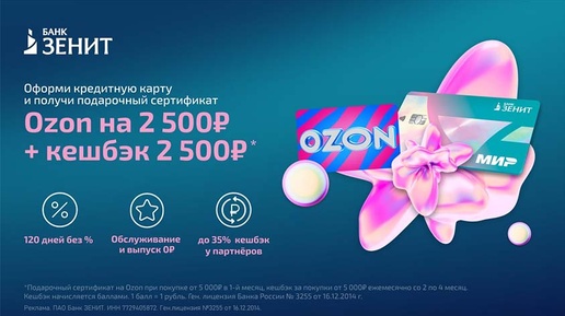 Срок действия акции: до 31 декабря 2024 г. Запущена новая акция по бесплатной кредитной карте банка Зенит «120+120 дней без %» для тех, у кого нет кредиток, заявок от 30 дней и предодобренных кредитных продуктов от банка. Вознаграждение складывается из сертификата на 2500₽ в OZON и кэшбэка 2500₽. 1. Оформите до 31 декабря карту с лимитом от 30 тыс. рублей по ссылке