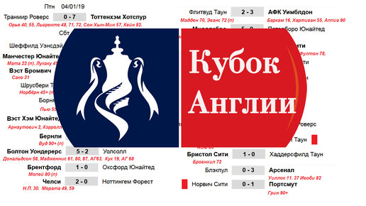 Привет всем! С 1/32 финала к кубку Англии присоединяются клубы премьер-лиги. Тоттенхэм не оставил шансов клубу Транмир Роверс. Травмировав их 7 раз. У Орье дубль, испанец Льоренте оформил хет-трик, Сон Хын-Мин забил и ехал на кубок Азии и конечно же отличился Кейн. Тоттенхэм вышел в 1/16 финала. За последние 5 игр «шпоры» забили 22 гола, в среднем 4,4 мяча за матч. Превосходно. 17 лет назад лондонцы выиграли у «бродяг» 4-0. Шеффилд Уэнсдей и Лутон голов не забили, их ждет переигровка 15 января...