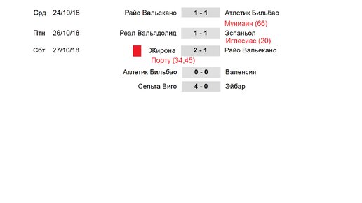 начнем наш обзор результатов, с игры Райо Вальекано Атлетик Бальбао, это была перенесенная игра 3 тура, 1-1. За Атлетик отличился Икер Муниаин, который забил свой 4 гол. После этой игры оба клуба продлили свои без выигрышные серии. У Райо Вальекано она длится 6ю игру, у Атлетика на 1 матч больше. Ну а теперь 10 тур. Вальядолид Эспаньол, и тут тоже 1-1. Борха Иглесиас забил свой 5 гол в чемпионате. А Хозяева спасли игру в компенсированное время. И после этой игры обе команды продлили свои без проигрышные серии, у Вальядолида 6 таких матчей, у Эспаньола на игру меньше...
