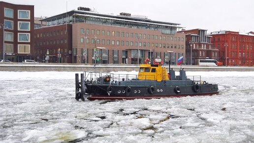 Это один из тех ледоколов, которые работают зимой в Москве и пробивают пути в замерзшей реке. Он обеспечивает работу на Москве-реке электросудов и других теплоходов в зимний период.