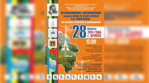В Брянске в четверг, 28 февраля, пройдут всероссийские соревнования по легкой атлетике в помещении памяти заслуженного тренера РСФСР и СССР Вячеслава Самотёсова. Местом проведения соревнований станет легкоатлетический манеж, носящий имя прославленного брянского тренера. Торжественное открытие соревнований начнется в 12:00.В программе забеги спринтеров, прыжки в высоту и бег на 1000 метров у мужчин и женщин. Участие в состязаниях примут сильнейшие спортсмены страны, например, спринтеры-финалисты прошедшего в минувшие выходные в Москве чемпиона России в помещении...