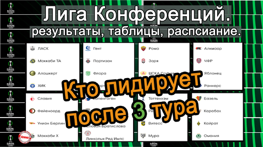 Это результаты, таблица и список бомбардиров Лиги Конференций. В первой группе хозяева играли в меньшинстве. Таблица. Истанбул – 7 очков. У Фиорентины – 4, у Хартса на очко меньше, у РФШ – 2. Таблица. Вест Хэм три тура прошёл без потерь. Андерлехт и Силкеборг закрепились в середине. Стяуа выглядит аутсайдером. Смотрим таблицу. Вильярреал имеет 100%-результат. У Леха – 4, у Хапоэля – 2, у Аустрии – 1. В четвёртой группе две минимальные победы. Этот матч собрал наибольшее число зрителей (47 тыс...
