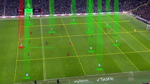 Расположение игроков на поле. Первая минута матча и мы видим стандартный подход Ливерпуля против Сити в прессинге. 4-3-3 Сити с Фернандиньо рядом с защитниками и двумя инсайдами, противостоит тройке полузащиты Ливерпуля. Но опять как я уже показывал ранее, игрок отвечающий за Фернандиньо играет очень грамотно, на такой картинке его действия хотя бы мы видим. Пока нет возможного коридора на Фернандиньо игрок ливерпуля не выбрасывается и сохраняет преимущество три против двух в центре поля. А не выбрасывается...