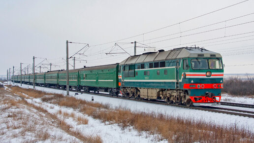 В наш век на железной дороге сложно найти что-то удивительное, но мы попытаемся. И сделать это совсем не сложно: достаточно прилететь в Волгоград, арендовать автомобиль и приехать на железнодорожный перегон Спартановка - пост 6 километр, ведь именно здесь курсирует один из среднеазиатских поездов. Знакомьтесь: Ташкент - Волгоград! 12 нарядных зеленых вагонов Узбекской железной дороги, ну не красота ли? И честно - мне без разницы, каков этот поезд внутри, мне в данном случае гораздо важнее картинка...