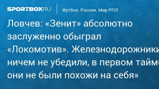 Advertisements Advertisements Ветеран «Спартака» Евгений Ловчев считает, что «Зенит» абсолютно заслуженно обыграл «Локомотив» в матче 14‑го тура МИР РПЛ. В субботу «Зенит» дома обыграл «Локомотив» со счетом 2:0. Ловчев заявил «Матч ТВ», что команда Семака была сильнее и полностью заслужила победу. По мнению Ловчева, «Локомотив» ничем не убедил и в первом тайме не был похож на себя. Команда не смогла показать достойную игру и заслуженно проиграла...