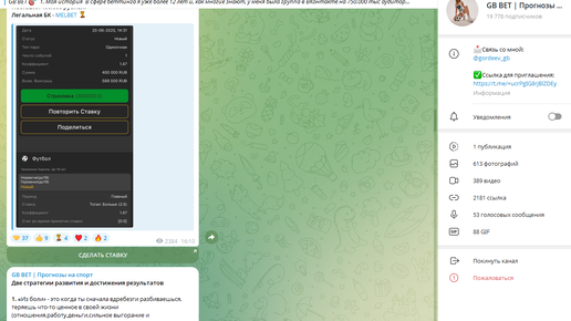 GB BET Прогнозы на спорт - это телеграмм-канал некоего каппера Дмитрия Гордеева @gordeev_gb. Проект GB BET сопровождает свои посты ссылкой на букмекерскую контору Мелбет. Стоит ли работать с данным аналитиком - разберем в статье. Дополнительная монетизация канала Дмитрия Гордеева идет с помощью вип-прогнозов. На канале временами появляются "благодарности" от его клиентов, что обычно является причиной заказных отзывов. В целом на канале нет ничего интересного - обычные прогнозы с низкими коэффициентами...