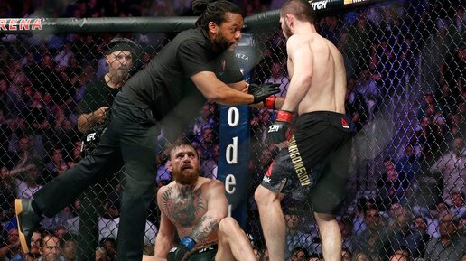 Это был блестящий бой в стиле Хабиба,поэтому драки в стойке мы почти не увидели,весь бой проходил в партере. Раунд 1: Толпа про-Макгрегора ревет, Херб Дин дает сигнал, и мы в ожидании. Макгрегор действует первым номером,чтобы нокаутировать Хабиба, но этот бой быстро оказывается на земле — прямо там, где этого хочет Нурмагомедов. Макгрегор держит его, но Нурмагомедов завершает тейкдаун, и у него есть ноги Конора в захвате. Толпа гудит,так как это не то действие, которое они хотели видеть. Но Нурмагомедов следует своему плану...