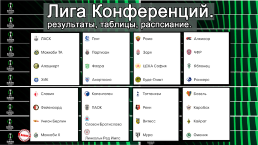 Здравствуйте, уважаемые любители футбола. В Лиге Конференций завершился второй тур группового этапа. В первой группе армянский Алашкерт проиграл финскому ХИК 2:4. Таблица. Маккаби Тель-Авив и ЛАСК набрали по 4 очка. У ХИКа – 3, у Алашкерта - 0. Расписание. 21 октября ХИК сыграет с Маккаби Тель – Авив, Алашкерт примет Ласк. Группа В. Таблица. Партизан и Гент вырвались в лидеры (по 6 очков). Анортосис и Флора замыкают таблицу. Расписание. Анортосис – Флора, Партизан – Гент. Группа С. Таблица. Рома имеет 6 очков, Будё / Глимт добыл 4, у софийского ЦСКА – одно, у Зари - 0...