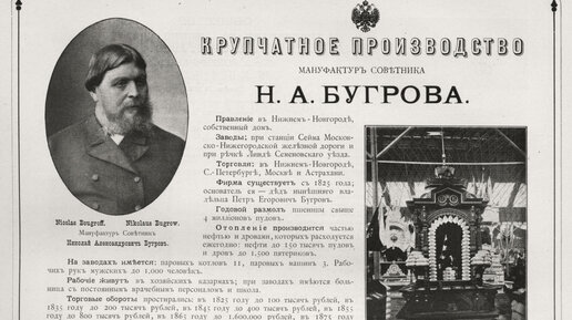 Купец Николай Александрович Бугров - одна из выдающихся фигур российского предпринимательства XIX века. Его имя тесно связано с развитием торговли и промышленности в России, а также благотворительной деятельностью, оставившей яркий след в истории страны. «Миллионер, крупный торговец хлебом, владелец паровых мельниц, десятка пароходов, флотилии барж, огромных лесов, - Н. А. Бугров играл в Нижнем и губернии роль удельного князя» - писал Максим Горький в своем очерке «Н. А. Бугров». Биография Николая...