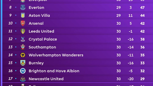 Турнирная таблица АПЛ после 30 туров