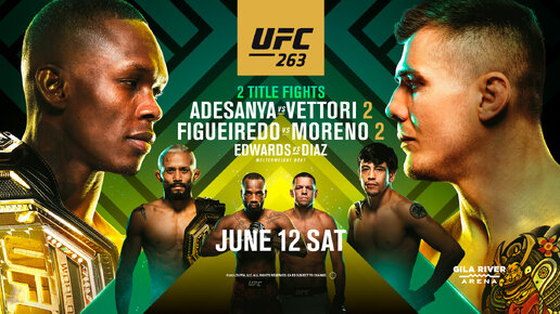 Уже совсем скоро пройдет UFC 263 и на этом турнире пройдет несколько крутых боев: действующий чемп среднего веса Израэль Адесанья встретится с давним соперником-Марвином Веттори,так же подерется боец,идущий на серии из 8 побед Леон Эдвардс, а его соперником станет всем известный Нейт Диаз,который за последние 5 лет дрался всего 2 раза,еще мы увидим реванш чемпиона наилегчайшего веса - Дивейсона Фигередо и Брендона Морено, показавшие в первом бою лучший поединок 2020 года. Но все внимание зрителей...