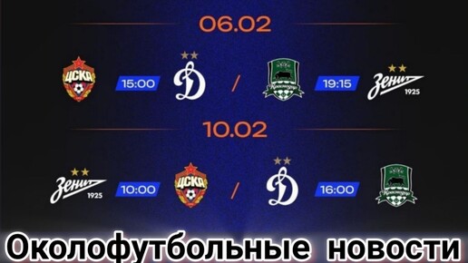 Расписание Зимнего кубка РПЛ-2026 3 февраля (вторник) 15:00 «зенит» – «Динамо» 19:15 ЦСКА – «Краснодар» 6 февраля (пятница) 15:00 ЦСКА – «Динамо» 19:15 «Краснодар» – «зенит» 10 февраля (вторник) 10:00 «зенит» – ЦСКА 16:00 «Динамо» – «Краснодар» *время московское Все матчи в прямом эфире покажут телеканалы «Матч ТВ» и МАТЧ ПРЕМЬЕР. Информация о билетах на матчи будет опубликована дополнительно...