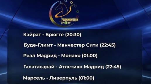 Телеканал Türkmenistan Sport опубликовал список матчей Лиги чемпионов УЕФА, которые будут доступны зрителям 20 и 21 января 2026 года. Трансляции пройдут в прямом эфире, время указано по ашхабадскому часовому поясу, сообщает turkmenportal.