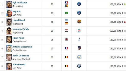 Трансферная стоимость футболистов в 2019: Мбаппе остаётся самым дорогим в мире