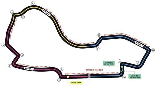 ) И точку детекции использования кнопки Overtake. ‼️ ЗАПОМИНАЕМ: теперь перед каждым уик-эндом вместе с расписанием будем размещать схему трассы. Чтобы зрители понимали, в каких местах у машин будут открываться закрылки спереди и сзади (SM - straight mode, в народе режим двойного DRS - спереди и сзади). МОЖНО ИСПОЛЬЗОВАТЬ ПОСТОЯННО В ЭТИХ ЗОНАХ. БЕЗ ПРИВЯЗКИ К СОПЕРНИКАМ. ‼️ Зона детекции означает, что если в гонке между двумя машинами...