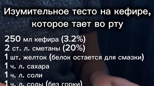 Это тесто можно назвать ЛЕНИВЫМ слоеным, так как принцип его приготовления похож на слоеное бездрожжевое тесто. Сода, гашённая в кислом кефире, создаёт пузырьки воздуха, а раскатывание с маслом делает его слоистым и нежным. Выход: около 700-800 гр теста, примерно 12-15 средних пирожков ✅ Ингредиенты: — 250 мл кефира (3.2%) — 2 ст. л. сметаны (20%) — 1 шт. желток белок оставляем для смазки — 1 ч. л. сахара — 1 ч. л. соли — 1 ч. л. соды (без горки) — 1 ст. л. подсолнечного масла (без запаха) +...