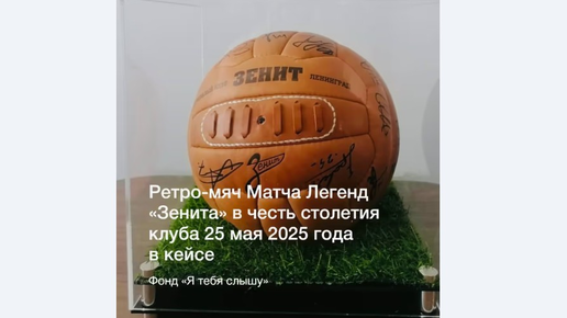 Футбольный клуб «Зенит» представил уникальный лот на благотворительный аукцион Meet for Charity - ретро-мяч с автографами легенд «Зенита»: Сергея Семака, Андрея Аршавина, Александра Кержакова, Анатолия Бышовец, Фернандо Мейра и других. Каждая подпись на этом мяче — кусочек истории клуба, который в этом году отмечает 100 лет. АНО «Я тебя слышу» стала партнером акции «100 добрых дел» - это марафон из 100 социальных и благотворительных проектов различного масштаба и размаха, которые «Зенит» вместе с болельщиками проводит на протяжении всего 2025 года...