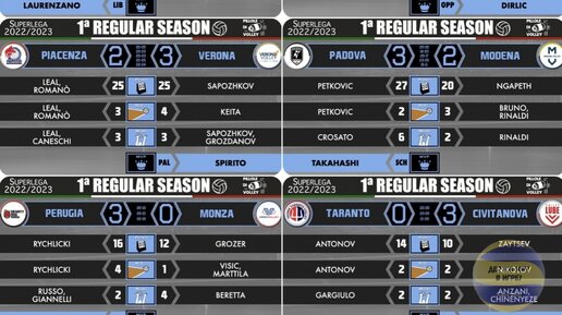 Первого и второго октября стартовал мужской розыгрыш итальянской Суперлиги по волейболу: «Трентино» — «Сиена» — 3:1 (25:16, 25:21, 23:25, 25:17)