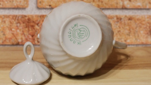 В моей коллекции появился фарфоровый молочник времён СССР. Это именно молочник, а не сливочник. Его объём 300 мл, а сосуды 200-500 мл называют молочниками. Молоко нежирное, поэтому в чай или кофе его добавляют больше, а сливочниками называют ёмкости 50-200 мл. Кроме того, крышка бывает только у молочников. Судя по клейму, этот молочник выпущен в городе Капчагай Казахской ССР. На клейме кроме надписи «Капчагай», есть надпись «ПТУ», буква «С» и цифра «3». Меня это клеймо заинтересовало. Фарфор в Капчагае...