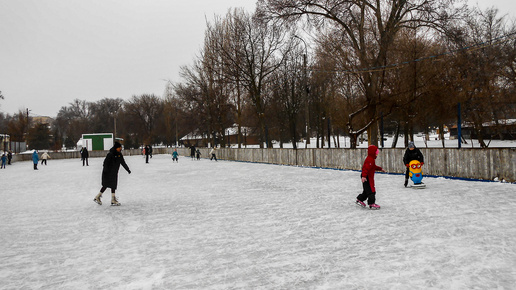 В Камышине в парке Комсомольцев-добровольцев, несмотря на ненастную погоду, взрослые и дети решили провести время на катке (ВИДЕО)
