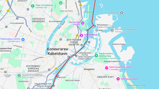 В Копенгагене действует морской трамвай. Его ещё именуют "паромом" или "havnebus." Расплачиваться в нём можно картой Rejsekort, как и во всех других видах городского общественного транспорта. Курсирует он от станции метро Sluseholmen (нужно немного пройти до причала Teglholmen) до станции метро Orientkaj и в обратном направлении (в расписании это два разных номера маршрута, №991 в направлении Teglholmen и №992 в направлении Orientkaj). Движется он не быстро, много времени проводит, выполняя швартовку на остановках, и ходит не часто...