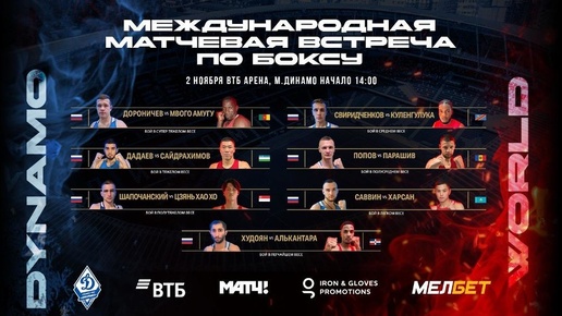 В Москве состоится международная матчевая встреча между сборной мира по боксу и «Динамо». Встреча пройдёт 2 ноября на «ВТБ Арене». Соревнования пройдут в семи олимпийских весовых категориях, а бои будут состоять из трёх раундов по три минуты. За «Динамо» выступят бронзовый призёр чемпионата мира — 2023, чемпион Европы — 2024, пятикратный чемпион России Эдмонд Худоян, чемпион Европы — 2024, двукратный чемпион России Эдуард Саввин, чемпион Юношеских Олимпийских игр — 2018, чемпион России — 2024 Илья...