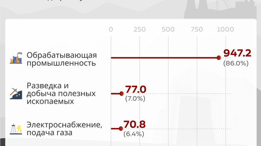 Самый большой объем занимает обрабатывающая промышленность – 86% от общего объёма. К ней относится: