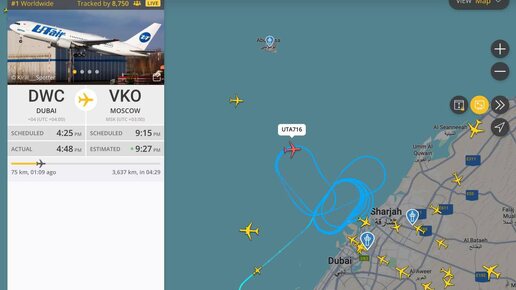 Flightradar servisi ma’lumotlariga ko‘ra, Dubaydan Moskvaga qarab uchayotgan Utair 716 samolyoti falokat haqida signal berdi va hozirda