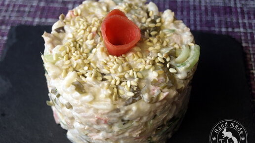 Рецепт, который предлагаю, мне практически приснился. Рассказала мужу, и мы немедленно пошли в магазин за недостающими продуктами. Не только моя заслуга в этом рецепте, муж тоже внес свою лепту, за что ему огромное спасибо. Подобных салатов много, но большинство из них дорогие, сложные и даже не очень вкусные. Я все упростила и получила гениальный результат! Нам понадобится: Для заправки: Для подачи: Рис отварим до готовности, откинем на сито и промоем. Рис при варке надо посолить, но совсем немного, соли в салате итак будет достаточно...