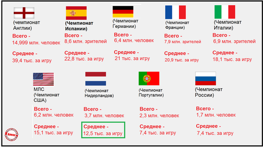 Пойдём с козырей. Сначала смотрим посещаемость последнего сезона чемпионата Испании. Самым успешным клубом стала Барселона - 54 тыс. болельщиков за игру. Высшую испанскую лигу в сезоне 2021/2022 посетило 8,6 млн человек. Средняя посещаемость сезона - почти 23 тыс. за игру. Эту цифру можно не запоминать, в конце выпуска она появится в общей таблице. Италия. Интер здесь любят больше (45 тыс. зрителей за игру). Высшую итальянскую лигу посетило 6,9 млн человек. Средняя посещаемость сезона - 18 тыс...