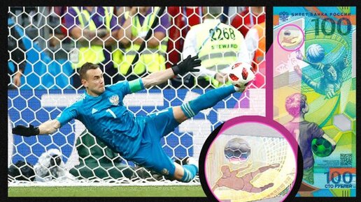 Центробанк перед началом чемпионата мира в России выпустил специальную “футбольную” купюру номиналом 100 рублей. После того, как вратарь российской сборной Игорь Акинфеев отбил пенальти в исполнении сборной Испании и вывел команду России в 1\4 чемпионата. Дело в том, что на купюре есть голограмма с вратарем, который в полете бьет левой ногой по мячу. Ровно в такой же позе Игорь Акинфеев отразил последний пенальти от сборной Испании...