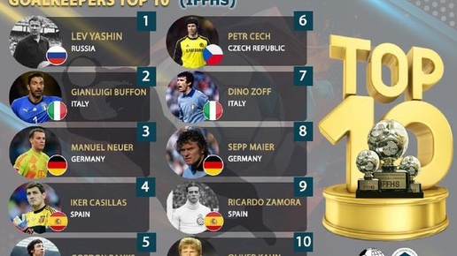 Лев Яшин назван лучшим вратарём в истории футбола по итогам рейтинга IFHFHIS, обойдя таких легенд как Буффон, Нойер, Касильяс, Бэнк и Чех