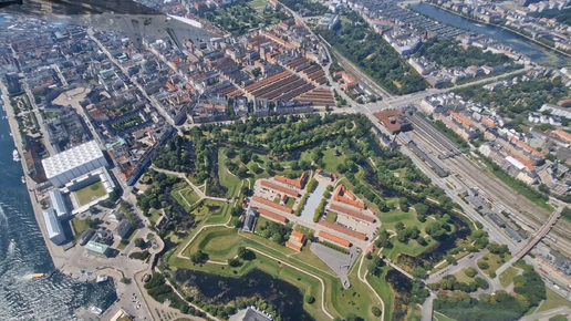 Прогулка была 14 декабря 2024 года; также есть несколько летних фотографий. В центральной части Копенгагена, в историческом центре, есть искусственный остров в окружении каналов, на котором расположена крепость Кастеллет - звездообразной формы, с бастионами. Аэропорт с гидросамолетом (видео полёта и фото) расположен прямо возле неё, и во время обзорного полёта над Копенгагеном летающая лодка проходит над крепостью. Воспользовавшись морским трамвайчиком Копенгагена (на фото выше он, жёлтенький, швартуется в левом нижнем углу), дождливым декабрьским днём я добрался в окнестности Кастеллета...