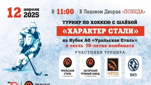Комбинат «Уральская Сталь» организует хоккейный турнир для любительских команд. Это мероприятие проводится в четвертый раз в честь 70-летия комбината. 12 апреля в 11:00 на арене Ледового дворца «Победа» состоится открытие турнира. На льду сразятся коллективы новотроицких металлургов «Уральская Сталь», подмосковных трубопрокатчиков «ЗТЗ», челябинских «ЧТПЗ» и екатеринбургских «ВИЗ». Участникам предстоит провести четыре матча. В программе мероприятия запланировано яркое 3D mapping шоу, а также будут работать аниматоры в крупных куклах и аквагрим для детей...