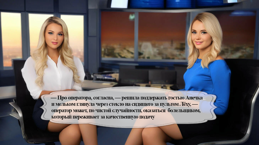Эксперимент продолжается, я пишу о жизни героини — сотрудницы ТРК по заданию моего литературного агента. Когда истории превратятся в книгу — не знаю. Какие ещё сопутствующие эпизоды добавятся, тоже не знаю. Это чистейшей воды экспромт с написанием современного романа, основанного на реальных событиях и своих материалах интервью. Из этических соображений имена реальных людей изменены. Вместо них появились герои, которых я наделила характерами прототипов. — Слышь, Анюта? Ты тута? Хочешь свежий анекдот про блондинок? — Конечно, это неизменное приветствие мог сказать только Костик...