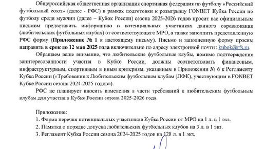 ❗️ Стало известно, почему футбольный клуб «Псков» не примет участие в Кубке России Для участия в Кубке России любительские клубы, помимо подтверждения заинтересованности, должны соответствовать финансовым, инфраструктурным, спортивным и иным критериям, указанным в приложении к регламенту турнира прошлого сезона, говорится в официальном письме Российского футбольного союза (РФС) за подписью генерального секретаря организации Максима Митрофанова, которое есть в распоряжении редакции ПАИ (первая картинка)...