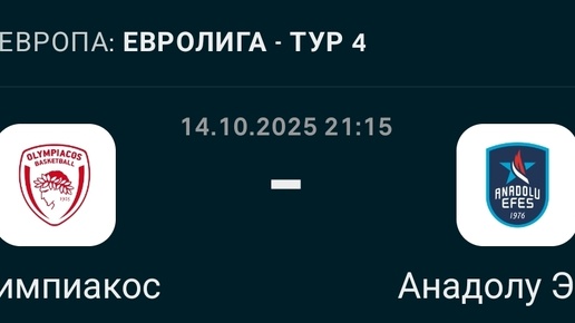 Общая информация о матче Матч четвертого тура регулярного чемпионата Евролиги между греческим "Олимпиакосом" и турецким "Анадолу Эфесом" состоится 14 октября 2025 года в Пирее на арене "Дружба и Мир". Начало встречи запланировано на 21:15 по московскому времени. Турнирное положение На момент проведения анализа турнирная таблица Евролиги находится на начальной стадии формирования. "Олимпиакос" провел три матча, одержав две победы и потерпев одно поражение (результат 2-1). "Анадолу Эфес" имеет менее уверенные показатели, выиграв одну встречу и проиграв дважды (результат 1-2)...