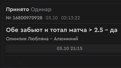 Номер два на сегодня 😈 аргументы за: ✅ Алюминий забивает в 8 матчах кряду ✅ В последних 3 матчах, где принимает участие Алюминий, забивают обе команды ✅ Олимпия Любляна забивает в 7 матчах кряду, тем более будет дома ✅ У Олимпии средний тотал матча = 1.5 (забивают) + 1.5 (пропускают) = 3.0. У Алюминия = 1.5 + 1.7 = 3.2. Это прямо указывает на матчи с 3 и более...