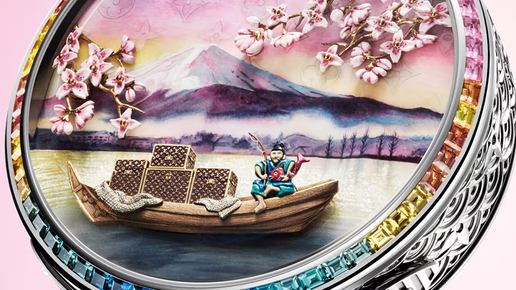 Будь с нами в Telegram | YouTube Вы наверняка помните эти часы с другой картинкой на циферблате: Париж, мосты через Сену и баржа, груженная чемоданами Louis Vuitton. В новой версии часов чемоданы загружены в рыбацкую лодку, проплывающую на фоне горы Фудзи. Рядом с ними сидит японский бог удачи, приманивающий богатство удочкой и рыбой в руках. Механизм у часов тот же, что и во «французской» версии...