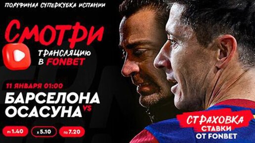В прошлом сезоне «Барселона» выиграла Суперкубок Испании, в финале одолев мадридский «Реал». В этом розыгрыше Суперкубка команда Хави сыграет в полуфинале с «Осасуной» – прошлым финалистом Кубка Испании. Посмотреть прямую трансляцию этого матча бесплатно смогут клиенты FONBET – букмекера с самыми быстрыми выплатами в Казахстане. Где смотреть прямую трансляцию «Барселона» – «Осасуна» Матч между «Барселоной» и «Осасуной» состоится в 01:00 по Астане, в ночь с четверга на пятницу, 12 января, на нейтральном стадионе в Эр-Рияде...