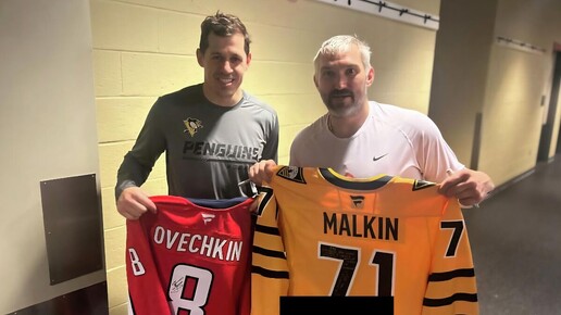 Российские нападающие Александр Овечкин из "Вашингтон Кэпиталз" и Евгений Малкин из "Питтсбург Пингвинз" обменялись игровыми формами после матча регулярного чемпионата Национальной хоккейной лиги (НХЛ). В ночь на пятницу по московскому времени "Питтсбург" обыграл дома "Вашингтон" (5:3). Овечкин отметился двумя голевыми передачами, Малкин - одной. После первого периода матча "Питтсбург" и его болельщики поздравили Овечкина с 900-й в шайбой в регулярных чемпионатах НХЛ...