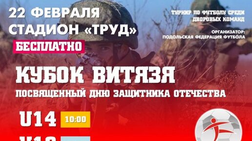 Как сообщили в пресс-службе ФК «Витязь», 22 февраля на запасных полях спорткомплекса «Труд» Подольская федерация футбола проведет уже традиционный турнир ко Дню защитника Отечества – Кубок Витязя. Турнир пройдет в трех возрастных категориях — до 14, 16 и 20 лет...