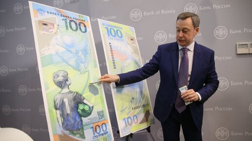 Представители Центрального Банка России показали новую сторублёвку, выпуск которой посвящён чемпионату мира по футболу 2018. Главной особенностью новой купюры является материал - пластик. Преимущества пластиковых купюр очевидны - большая долговечность. В дальнейшем эту технологию планируется ввести для остальных купюр. Юбилейные купюры можно будет купить в банке, выпустят их в количестве более 20 миллионов экземпляров...