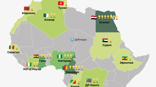 В воскресенье в Кот-д'Ивуаре завершается 34-й розыгрыш Кубка африканских наций — главный континентальный турнир для футбольных сборных из Африки. Квалифицировались на турнир 24 команды, а титул будет защищать сборная Сенегала. Удивительно, но сенегальцы выигрывали КАФ лишь один раз. Всего же обладателем трофея были 15 стран. Эту и другие интересные карты и инфографику о футболе вы можете увидеть в Телеграм-канале «Футбольная картография». Подписывайтесь, чтобы не пропустить обновлений! Больше всего побед одержал Египет (7), однако последняя была уже в далёком в 2010-м...